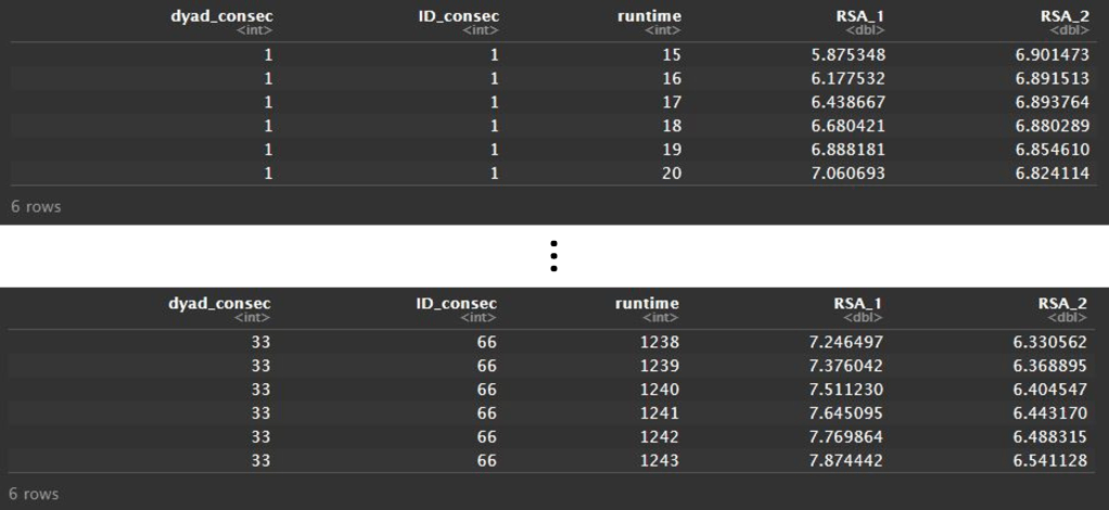 For this example, I am using a sample of 33 same gender platonic friend dyads who came into the lab and talked to each other for 20 minutes while electrocardiogram data were recorded. Respiratory sinus arrhythmia (RSA) which indicate high frequency change from heartbeat to heartbeat was extracted in 30 second sliding windows across the task to obtain second-by-second data as our measure of interest.